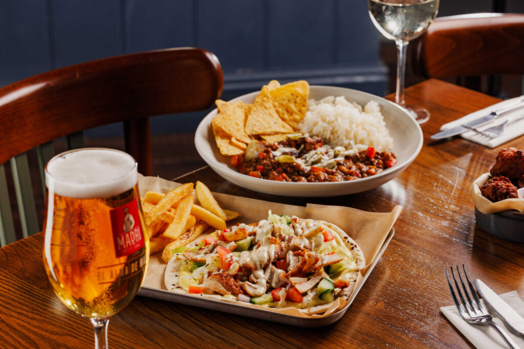 Chicken gyros, shredded seasoned chicken, fresh salad, garlic mayo on a Turkish-style flatbread, served with chips | 13.49 826 kcals